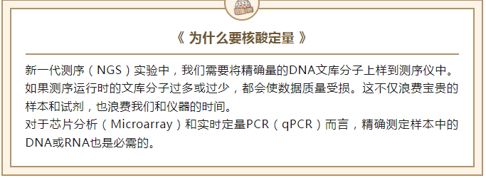 新一代測序(NGS)實驗中,我們需要將精確量的DNA文庫分子上樣到測序儀中。如果測序運行時的文庫分子過多或過少,都會使數(shù)據(jù)質量受損。這不僅浪費寶貴的樣本和試劑,也浪費我們和儀器的時間。對于芯片分析(Microarray)和實時定量PCR(qPCR)而言,精確測定樣本中的DNA或RNA也是必需的。