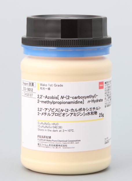 本產(chǎn)品為水溶性偶氮聚合引發(fā)劑。別名:偶氮二羧乙基-2-異丁基脒水合物。2,2'-Azobis[N-(2-carboxyethyl)-2-methylpropionamidine] n-Hydrate(引用文獻:和光純藥情報)